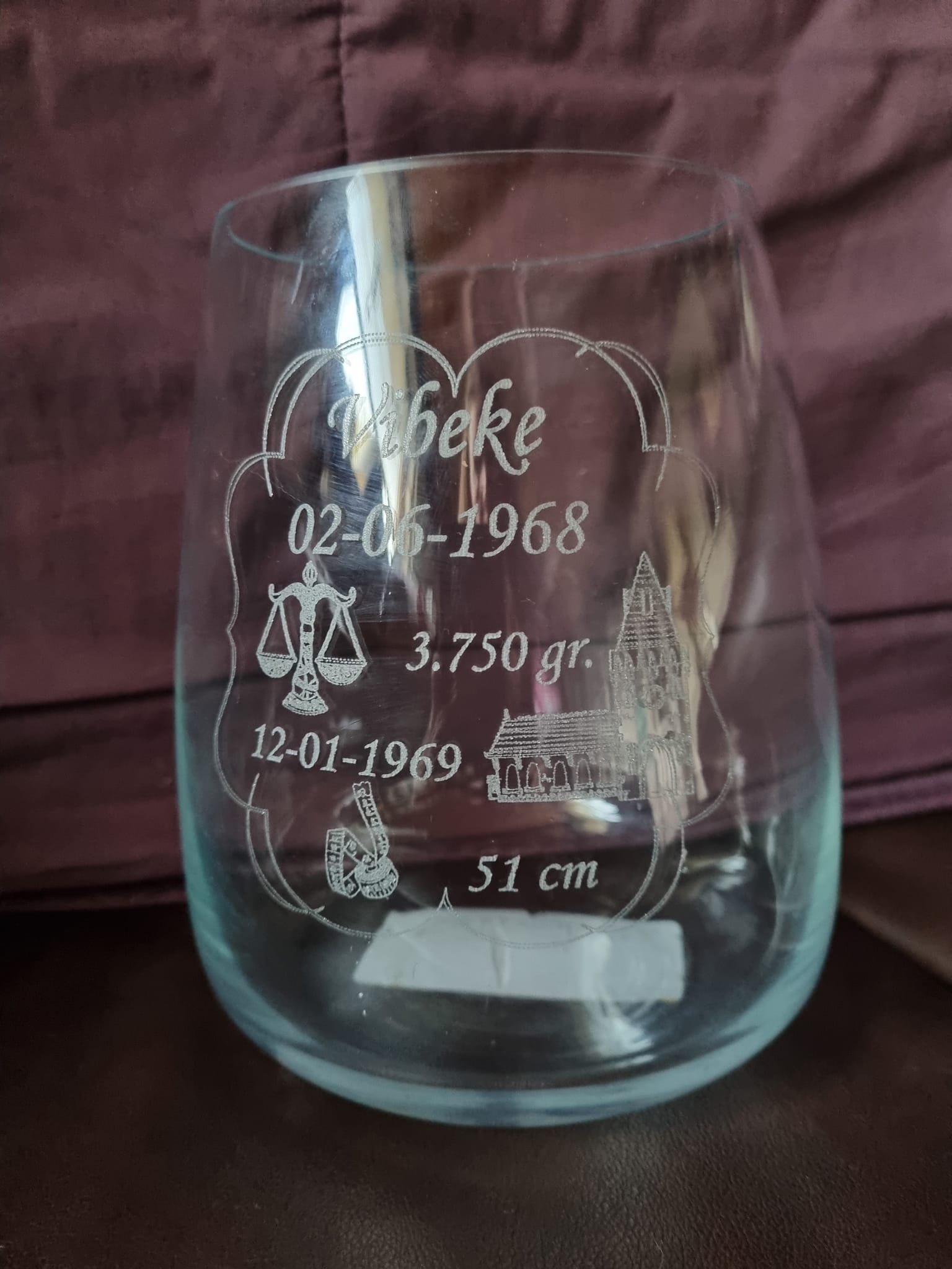 Graveret glasvase med barnets navn, fødselsdato, vægt, dåbsdato og længde ved fødslen.