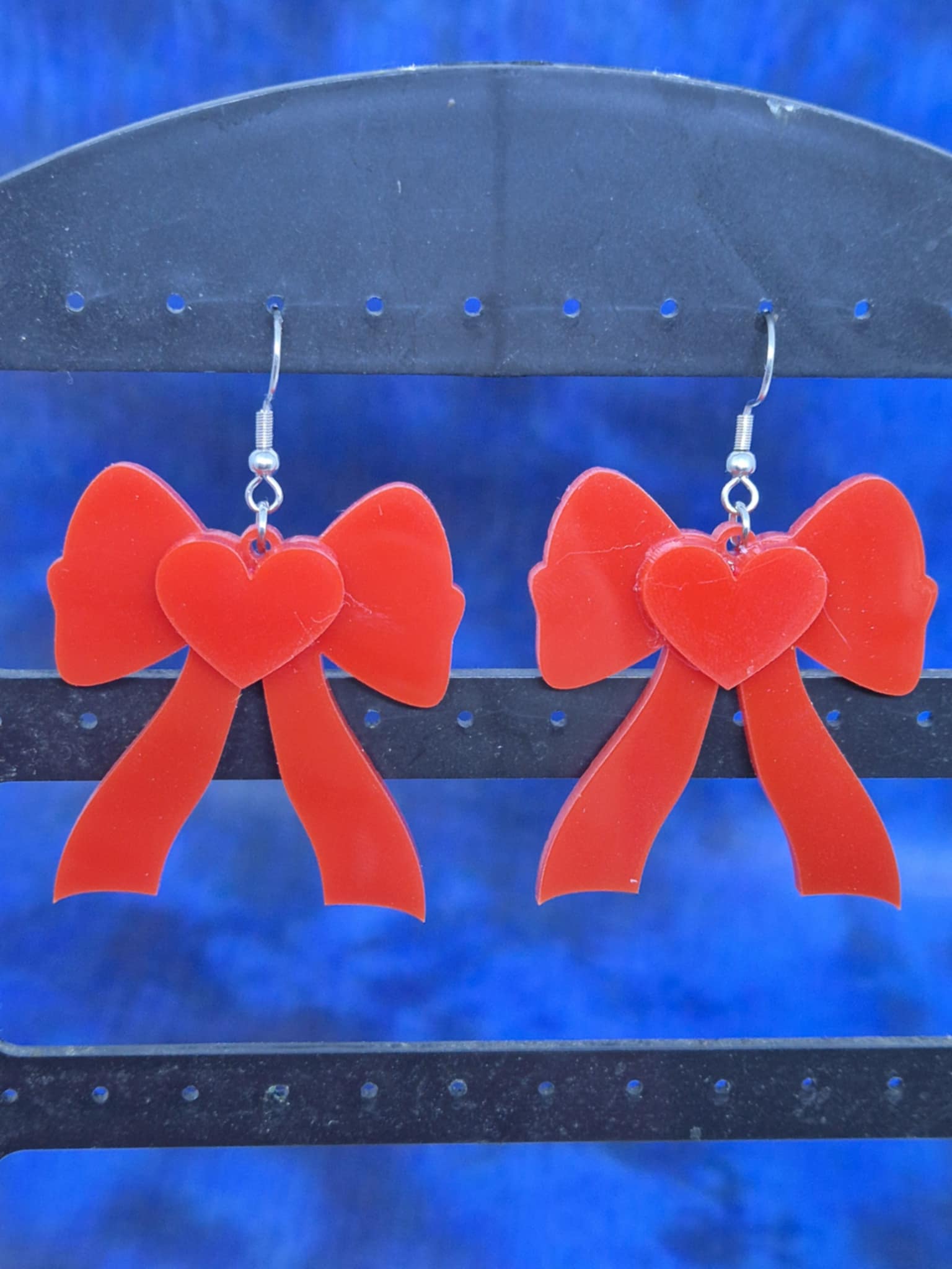 Øreringe med forskellige valentinemotiver i laserskåret akryl.